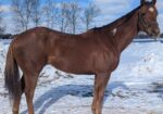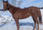 Bin has been lightly restarted. He is a tad on the lazy side but works through it well. Bin is the perfect gentleman for vet and farrier. He turns out well with others but likes to think he is the boss. His best friend is the biggest guy in our barn. Bin has been ridden bareback with just a halter and lead in our indoor and under English tack with our volunteer rider. He is UTD on shots, Coggins, and shoes.