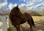 Are you looking for a marvelous mare? Meet Maggie! This sweet chestnut beauty is a 16 year old Missouri Fox Trotter. She’s lots of fun and was quick to make friends with some of our other horses. Maggie has the potential to succeed in various disciplines and styles, but will be a true project. We think she’ll do her best with an experienced, patient rider. If you think Maggie is the missy for your barn, inquire to adopt.